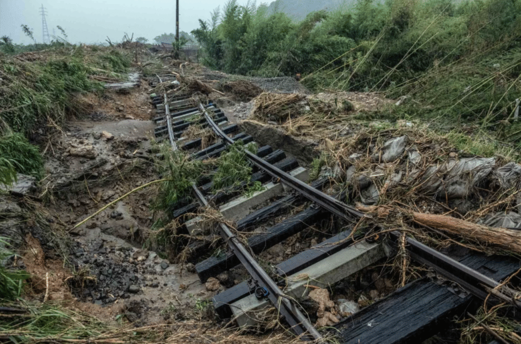 A rail line lies upturned after being submerged by floodwater when the nearby Kuma River burst its banks, on July 5 in Hitoyoshi, Japan. Carl Court/Getty Images